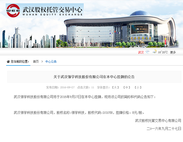 领学科技注册于2014年,2016年9月27日,成功在武汉股权托管交易中心挂牌。